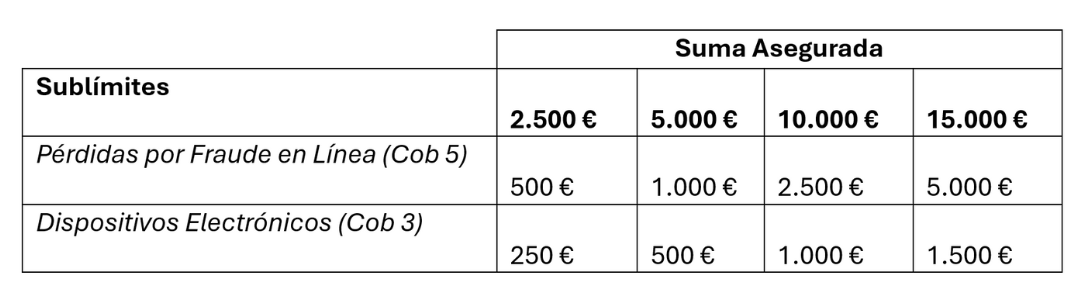 Seguro de Protección Digital no establece un límite al número de siniestros que puedas sufrir y del que des parte. Lo que sí establece la póliza son los límites económicos que se haya contratado en la póliza. Podrás elegir entre estar asegurado hasta un máximo de 2.500€, 5.000€, 10.000€ y 15.000€. Para algunas coberturas, se establecen sublímites, de acuerdo con la tabla anterior.