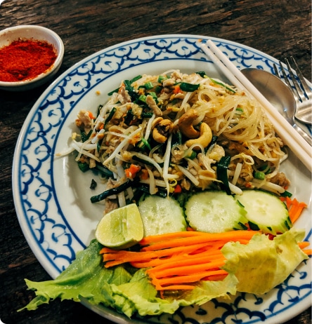 Uno de los platos más famosos es el Pad Thai. Se trata de unos tallarines de arroz con pollo o con gambas. ¡No puedes visitar el país sin probarlos!